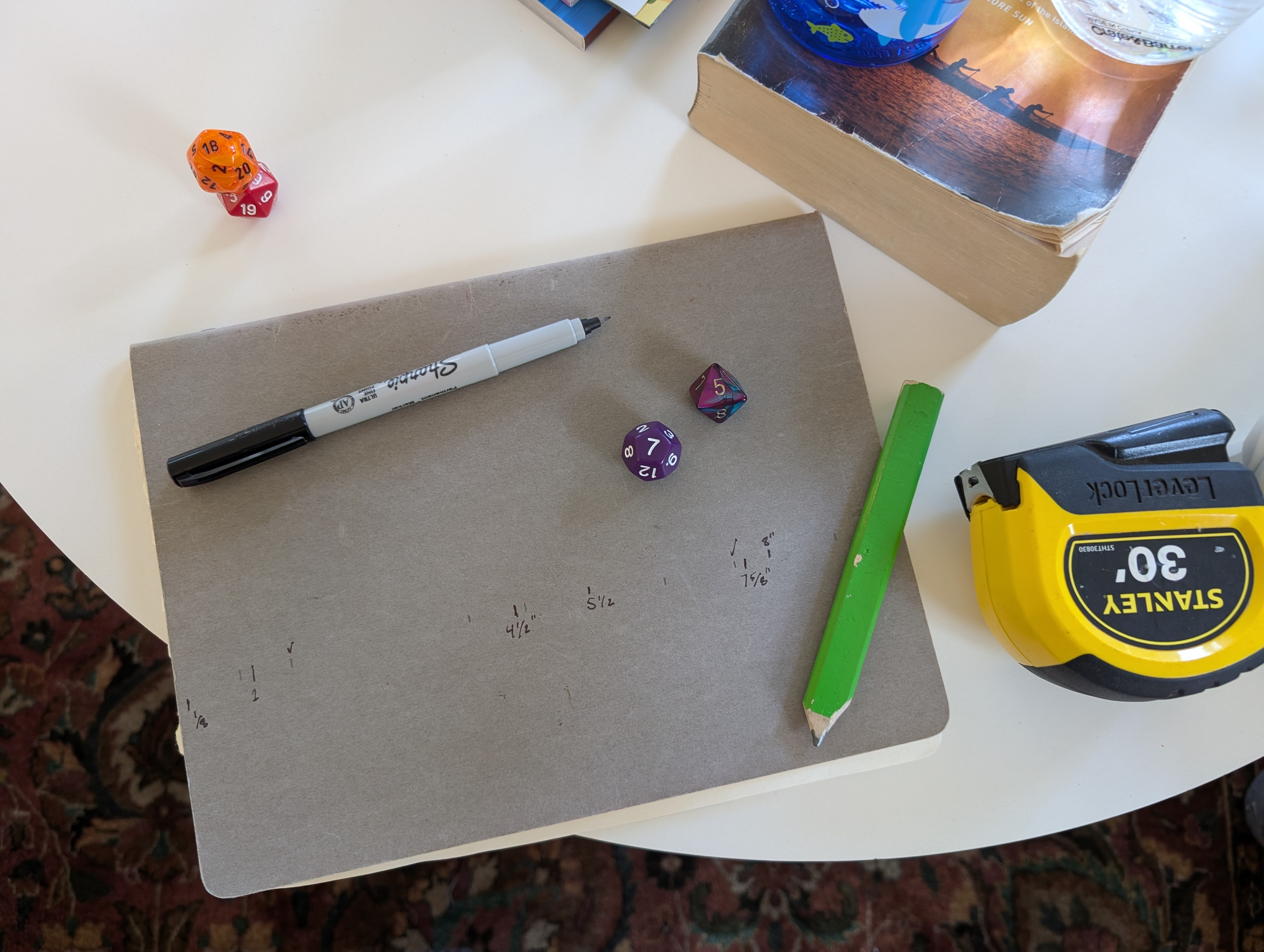 Twice Measured is a collaborative (or solo), GM-less game of arcane construction. Players form a work party of carpenters apprenticed to a wizard in the tower-building business. This game combines dice stacking and a tape measure accuracy challenge to simulate the joys, frustration, and quick skill-building experienced by new builders. Players make progress through failure and successes, and no prior construction experience is needed!